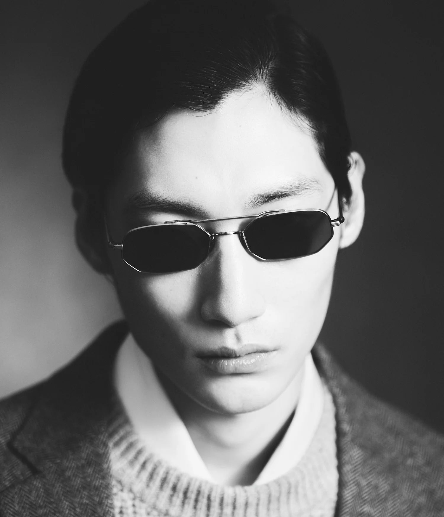 The impresario. A small rectangular sunglass with outsize style and impact. The thicker rim, filigreed top bar and slick color combinations project a bold, confident look with a hint of urban edge.
